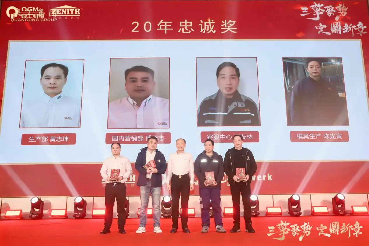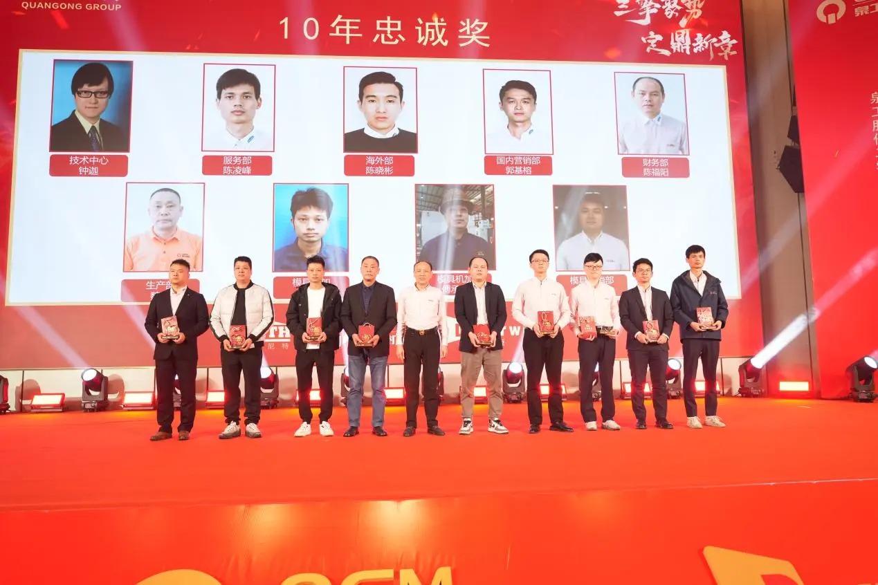 နှစ်ပတ်လည်အစည်းအဝေးတွင် 10 နှစ်၊ နှစ် 20 နှင့် နှစ် 30 သစ္စာစောင့်သိမှုဆုများအတွက်ခမ်းနားသောဆုပေးပွဲအခမ်းအနားကိုလည်းကျင်းပခဲ့သည်။ ကုမ္ပဏီနှင့် လက်တွဲပြီး အတူတကွ ကြီးပြင်းလာခဲ့ကြသော ဝန်ထမ်းတစ်စုသည် Quangong Machinery Co., Ltd. ၏ တည်ငြိမ်သော ဖွံ့ဖြိုးတိုးတက်မှုနှင့် ၎င်း၏ တည်မြဲသော ကော်ပိုရိတ်ယဉ်ကျေးမှု၏ ခိုင်မာသော အခြေခံအုတ်မြစ်ကို အပြည့်အဝ သရုပ်ပြခဲ့သည်။
